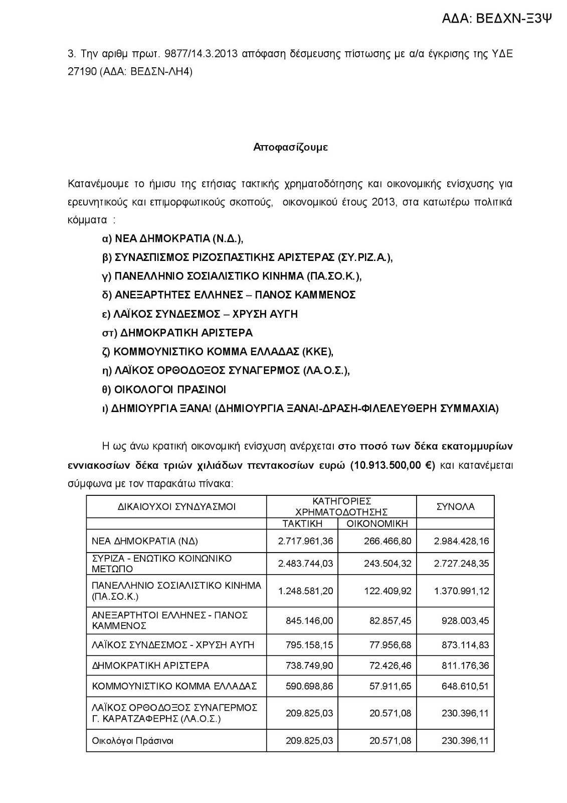 Για επιμορφωτικούς και ερευνητικούς σκοπούς κατανέμεται το 50% της κρατικής οικονομικής ενίσχυσης έτους 2013 στα πολιτικά κόμματα!!!