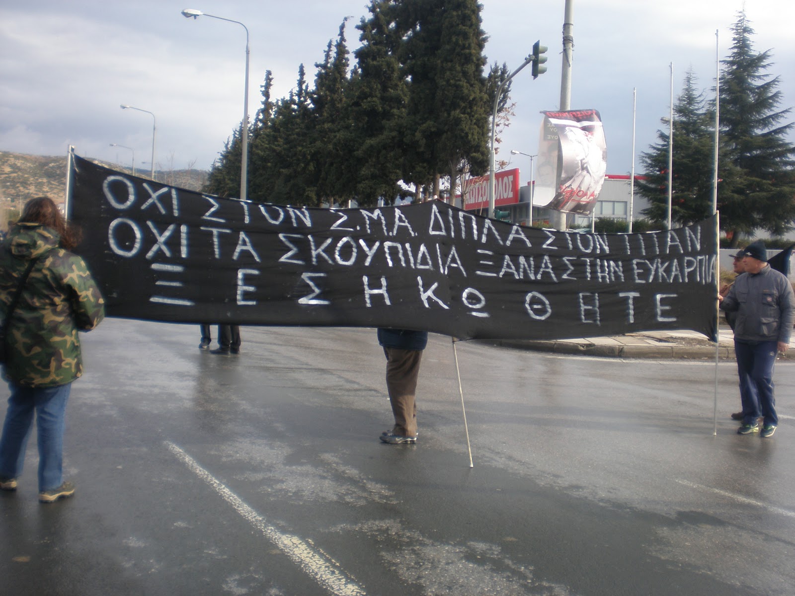 Τη Δευτέρα 18-4-2013, στις 9 το πρωί δικάζονται στο Πλημμελειοδικείο Θεσσαλονίκης 2 συμπολίτες μας (συνταξιούχοι 74 και 62 ετών αντίστοιχα), κάτοικοι της Ν. Ευκαρπίας, με την κατηγορία της «άσκησης παθητικής βίας» (!), επειδή διαμαρτυρήθηκαν για την κατασκευή του γιγάντιου ΣΜΑ Ν. Ευκαρπίας...