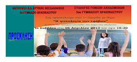 Το Σάββατο 6 Απρλίου στις 18.30 μμ θα πραγματοποιηθεί η εξ αναβολής ημερίδα στο 3ο Γυμνάσιο Ωραιοκάστρο...Η ημερίδα διοργανώνεται απο το 3ο γυμνάσιο και τον σύλλογο γονέων του 3ου γυμνασίου με θέμα " Η ψυχολογία των εφήβων". Ομιλητές οι κ Βαρσάμης Παναγιώτης, υπεύθυνος Συμβουλευτικού Σταθμού Νέων Δ.Δ.Ε. Δυτ. Θεσσαλονίκης και ο κ Κανταρτζής Ευάγγελος, ψυχολόγος - ψυχοθεραπευτής CBT.