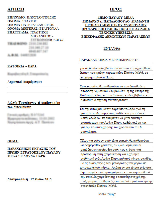 Αίτηση προς τον Δήμαρχο Παύλου Μελά, Διαμαντή Παπαδόπουλο, υπέβαλλε ο