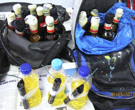- Δεκαοκτώ βόμβες μολότοφ (εκ των οποίων οι -3- εκρηκτικές) έτοιμες προς χρήση.