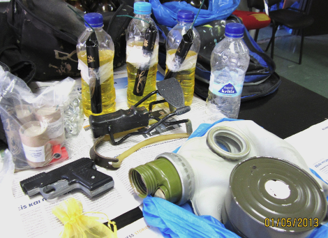 περιλαμβάνουν βόμβες μολότοφ, πιστόλι εκτόξευσης φωτοβολίδων, κροτίδες