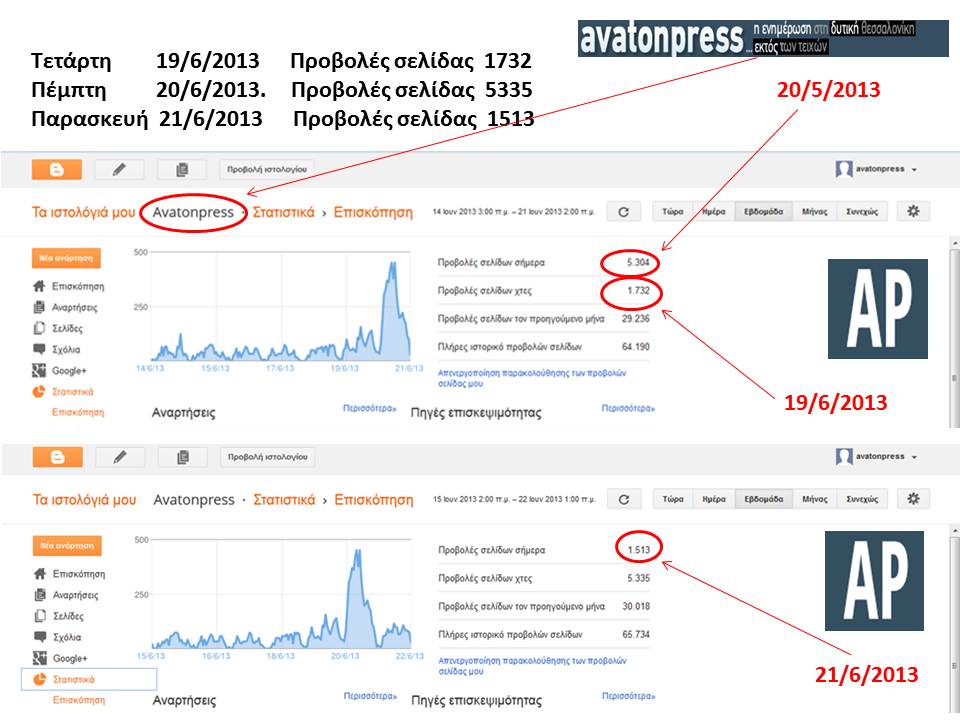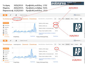Παρ' όλα αυτά επειδή η ικανοποίηση είναι πολύ μεγάλη, η χαρά είναι πολύ μεγάλη, μπαίνουμε στον πειρασμό να το ανακοινώσουμε και να το μοιραστούμε μαζί σας. Εδώ και λίγο καιρό βλέπουμε τις αυξητικές τάσεις του avatonpress, κανένας όμως απο εμάς δεν περίμενε ότι θα ερχόταν τόσο γρήγορα η στιγμή να γράψουμε αυτό το ΕΚΠΛΗΚΤΙΚΟ - ΦΑΝΤΑΣΤΙΚΟ νούμερο προβολών σελίδας που γράψαμε την Πέμπτη 20/6/2013, ημέρα που κλείναμε τον 4ο μήνα λειτουργίας μας, δηλαδή των 5335 προβολών σελίδων σε ένα 24ωρο.