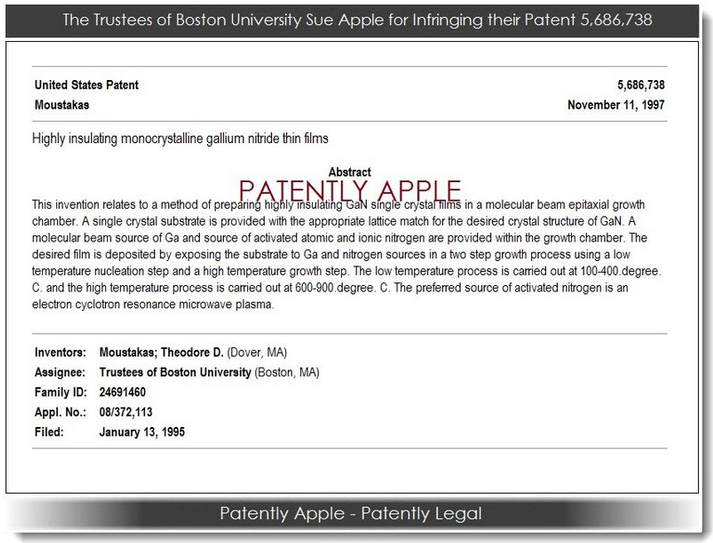 Σύμφωνα με την καταγγελία, ο Θεόδωρος Μουστάκας έχει ανακαλύψει την λεπτή μεμβράνη νιτρίδιου του γαλλίου, η οποία χρησιμοποιείται για την κατασκευή iPhone, iPad και MacBook air. Μάλιστα έχει κατοχυρώσει την ανακάλυψή του με δίπλωμα ευρεσιτεχνίας από τον Νοέμβριο του 1997.