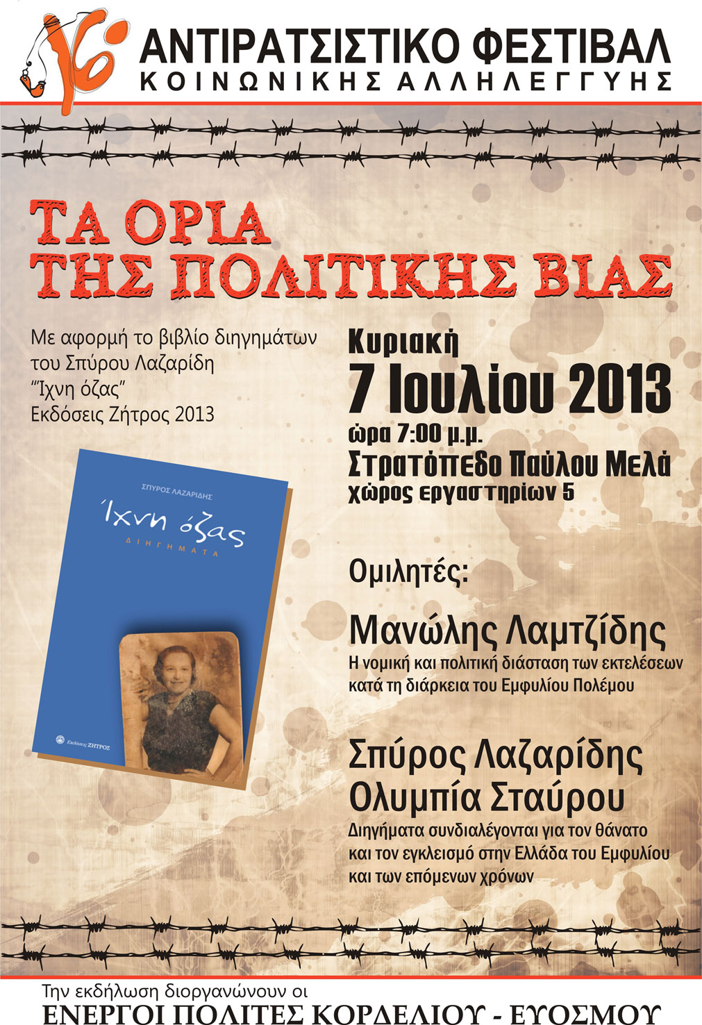 Οι Ενεργοί Πολίτες Κορδελιού Ευόσμου, με αφορμή την έκδοση του βιβλίου διηγημάτων Ίχνη όζας, του Σπύρου Λαζαρίδη, (εκδόσεις Ζήτρος, Θεσσαλονίκη, 2013) διοργανώνουν την Κυριακή 7 Ιουλίου 2013 στο στρατόπεδο Παύλου Μελά Χώρος εργαστηρίων 5 και ώρα 7:00 μμ εκδήλωση με θέμα "Τα όρια της πολιτικής βίας".