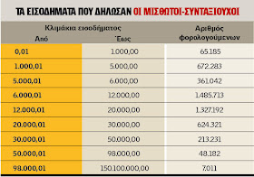 - 1.098.510 μισθωτοί και συνταξιούχοι, που αντιστοιχούν στο 22,86% του συνόλου, δήλωσαν ετήσιο εισόδημα έως 6.000 ευρώ, δηλαδή έως 500 ευρώ τον μήνα. Από αυτούς 65.185 δήλωσαν ετήσιο εισόδημα μέχρι 1.000 ευρώ.