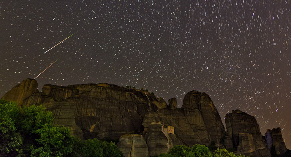 «Ενα μνημείο παγκόσμιας πολιτιστικής κληρονομιάς, τα Μετέωρα, στην Καλαμπάκα της κεντρικής Ελλάδας λούζεται από το απόκοσμο φως της βροχής των μετεωριτών». Η περιγραφή του ιστότοπου της NASA για την εκπληκτικής ομορφιάς φωτογραφία που τράβηξε στις 10 Αυγούστου ο Ιρανός φωτογράφος Μπαμπάκ Ταφρέσι.