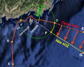 Στη παρακάτω φωτογραφία φαίνεται η παλαιά Ελληνική ΑΟΖ ABCDE (κόκκινη γραμμή) και η νέα ABCDFG όπως προκύπτει σαν αποτέλεσμα της απόφασης της Ελληνικής κυβέρνησης. Η πράσινη γραμμή αντιστοιχεί στα χωρικά ύδατα που αντιστοιχούν στη Στρογγύλη (6 ναυτικά μίλια).