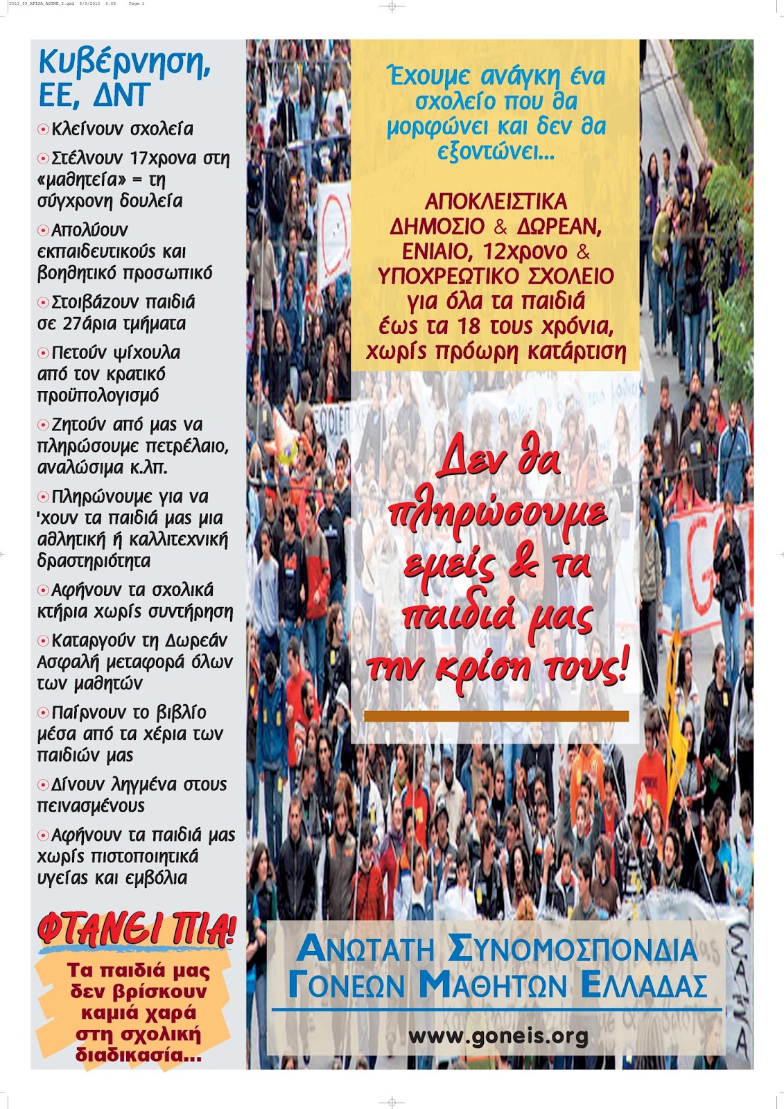 Ανώτατη Συνομοσπονδία Γονέων Μαθητών Ελλάδας: "Δεν θα πληρώσουμε εμείς & τα παιδιά μας την κρίση τους!"