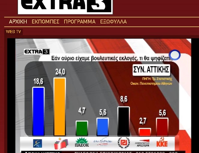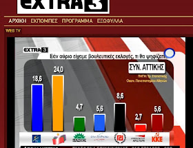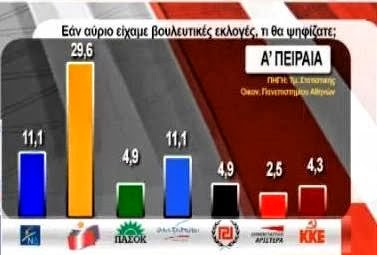 Σε δημοσκόπηση που παρουσιάστηκε στο ΕΧΤΡΑ3 από τον καθηγητή Πανά (ο οποίος είχε πρoβλέψει με ακρίβεια ο αποτέλεσμα των εκλογών του 2012), ο ΣΥΡΙΖΑ, διευρύνει τη διαφορά του από τη ΝΔ σε όλη την περιφέρεια της Αττικής.Χωρίς λόγια παραθέτουμε τις κάρτες που παρουσιάστηκαν από τη δημοσκόπηση του Οικονομικού Πανεπιστημίου υπό την επίβλεψη του καθηγητή Πανά: