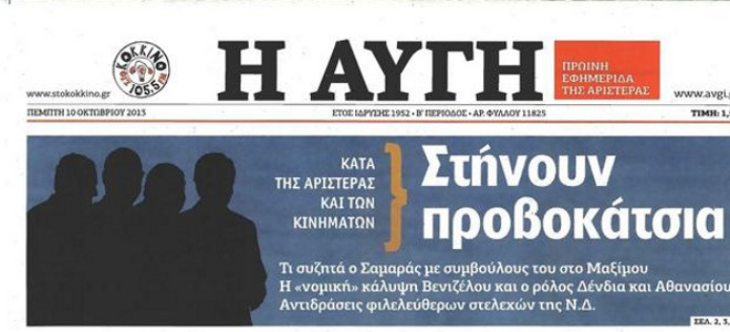 «Να χτυπηθεί η αριστερή βία, είναι το σύνθημα του Μαξίμου προς τα δυναμικά στηρίγματα της πολιτικής Σαμαρά τόσο στην αστυνομία και την ΕΥΠ, όσο και στη Δικαιοσύνη. Σειρά έχει ο ΣΥΡΙΖΑ, είναι το παρασύνθημα, ενώ έχουν τεθεί ήδη σε ετοιμότητα οι μηχανισμοί εκείνοι που ανέλαβαν να επιβεβαιώσουν στην πράξη τη θεωρία των δύο άκρων».