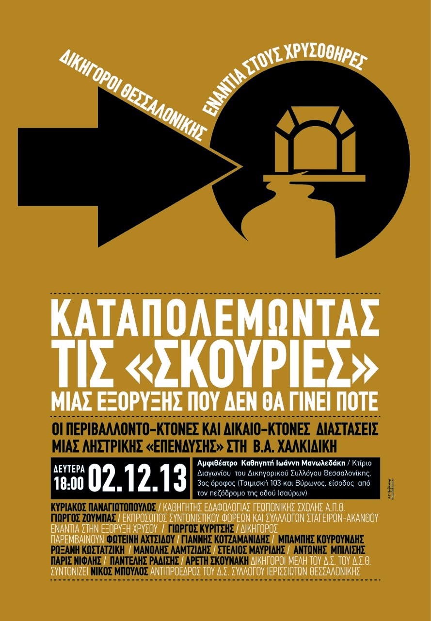 ΘΕΣΣΑΛΟΝΙΚΗΣ ΕΝΑΝΤΙΑ ΣΤΟΥΣ ΧΡΥΣΟΘΗΡΕΣ» την Δευτέρα , 2.12.2013 στις 18:00 (6μμ) στο Αμφιθέατρο