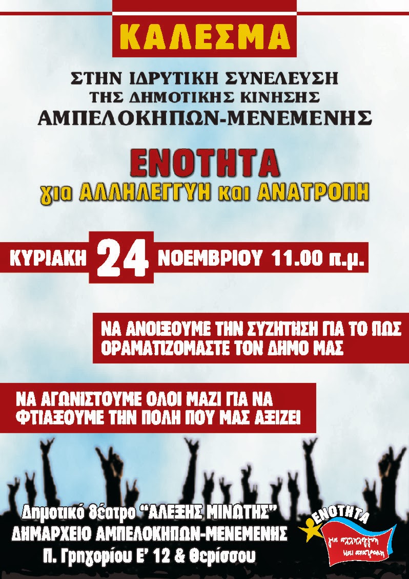 Ιδρυτική συνέλευση Δημοτικής Κίνησης Αμπελοκήπων-Μενεμένης "Ενότητα για Αλληλεγγύη και Ανατροπή"