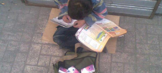 Μια εικόνα που σοκάρει -Παιδάκι πουλάει χαρτομάντιλα και διαβάζει τα μαθήματά του [φώτο]