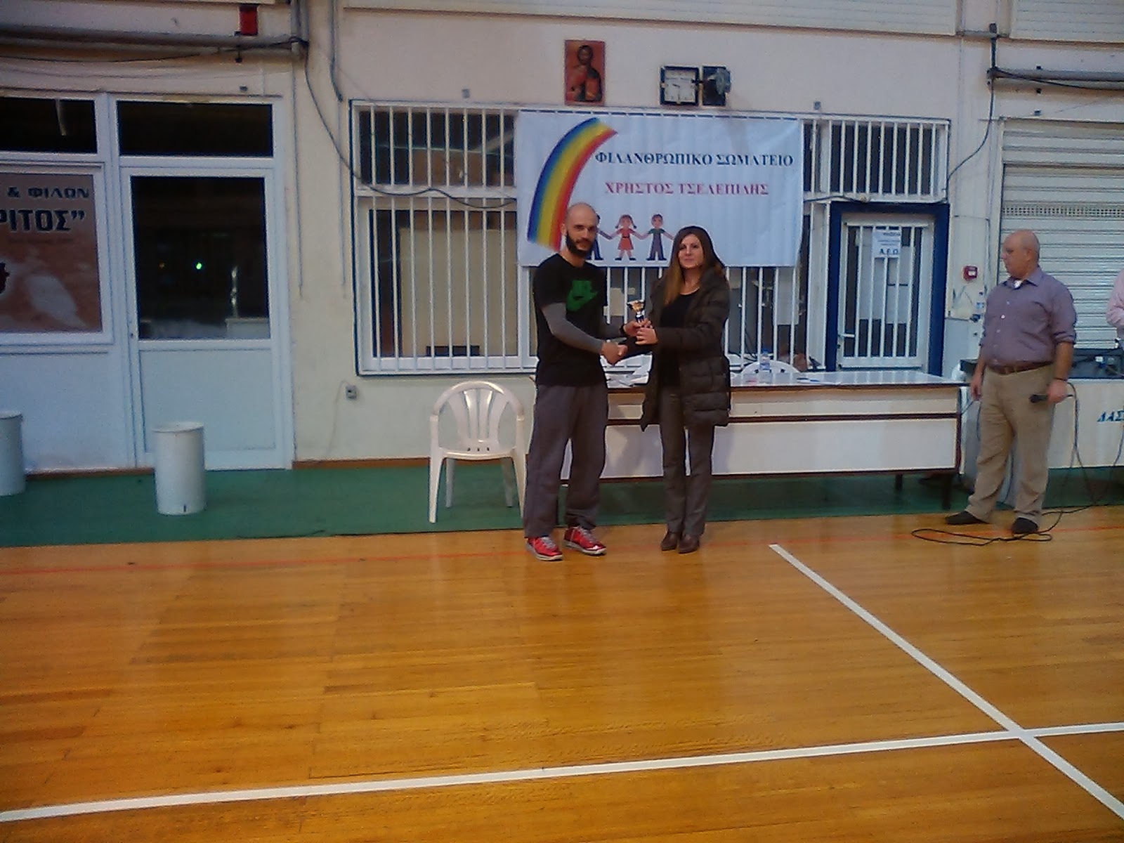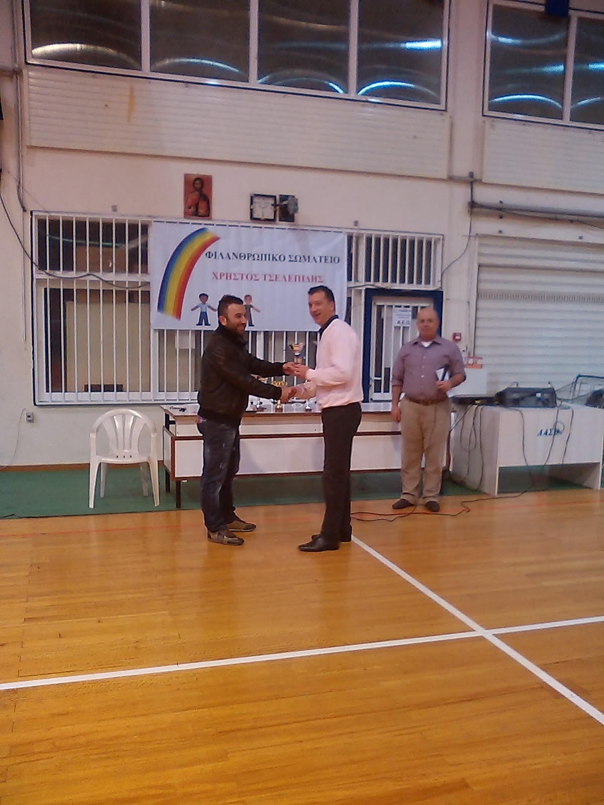 | Το μέλος του Δ.Σ. του Φιλανθρωπικού Σωματείου "ΧΡΗΣΤΟΣ ΤΣΕΛΕΠΙΔΗΣ" κ. Π. Τσακίρης βραβεύει τον αρχηγό του Σ.Α.Π.Κ. Νεάπολης κ. Τσαλικίδη για την κατάκτηση της δεύτερης θέσης |
