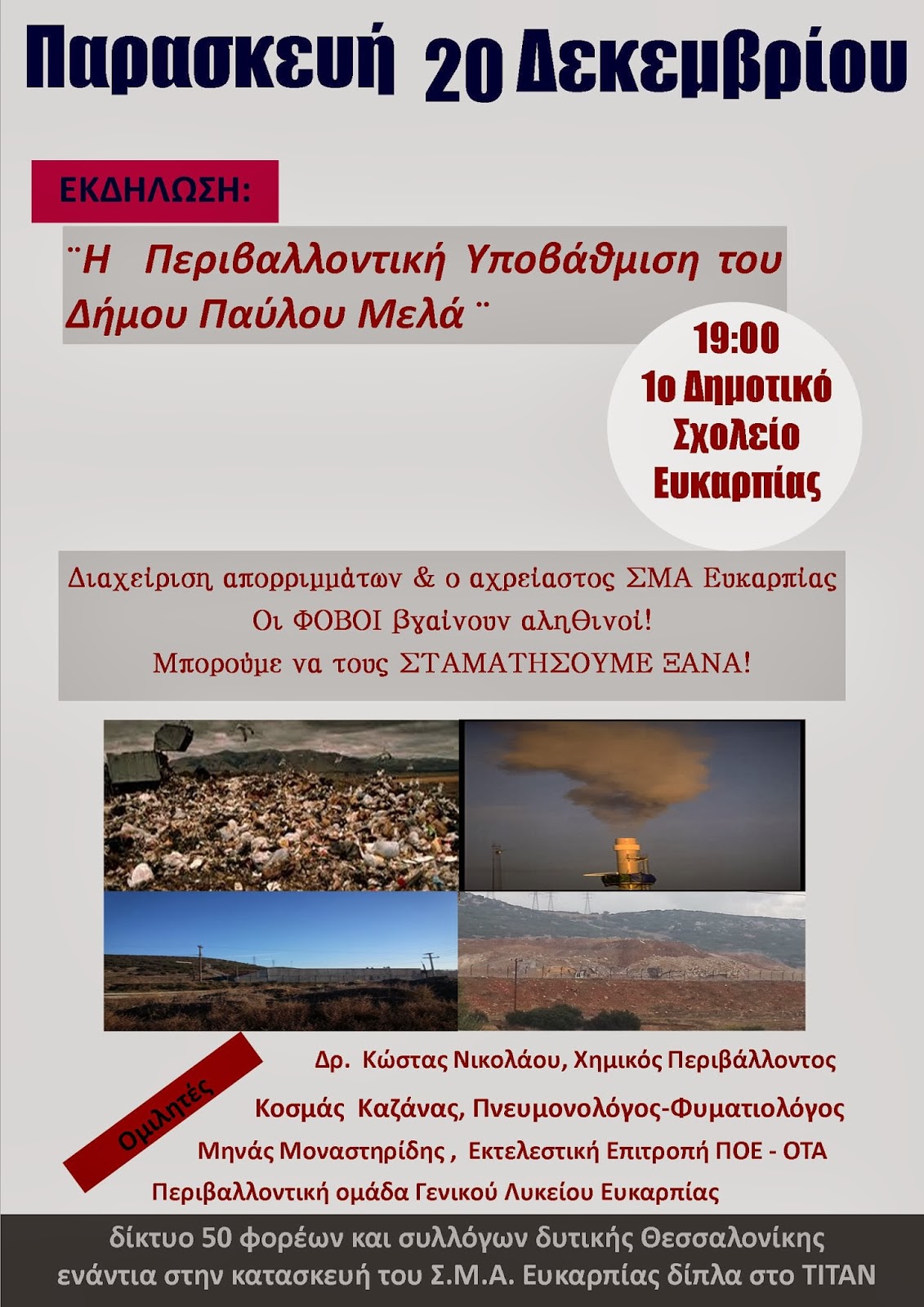 Σήμερα η εκδήλωση του δικτύου 50 στην Ευκαρπία : Ο αχρείαστος γιγάντιος ΣΜΑ, η διαχείριση των απορριμμάτων και η περιβαλλοντική υποβάθμιση του δήμου Παύλου Μελά