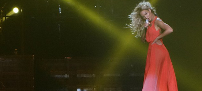 Η Beyonce εμφανίστηκε στην σκηνή με ένα κατακόκκινο φόρεμα με βαθιά ανοίγματα στη σκηνή και έκανε μία κίνηση η οποία από πολλούς θωρήθηκε άσεμνη και προκλητική: Εβαλε το χέρι της στο επίμαχο σημείο. Πολλοί άρχισαν να αναρωτιούνται αν με αυτό τον τρόπο η τραγουδίστρια ήθελε να προκαλέσει το κοινό της ή αν απλά το έκανε για να συγκρατήσει το φόρεμά της και να μην έχει.... αποκαλύψεις επί σκηνής.