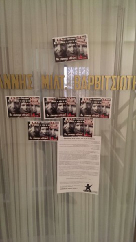 Ετσι, κόλλησαν στην πόρτα το ψήφισμα και έγραψαν συνθήματα κατά του υπουργού στο κτίριο. «Βαρβιτσιώτη είσαι δολοφόνος», «Το Φαρμακονήσι ήταν δολοφονία», «Κανένας άνθρωπος στη θάλασσα» και άλλα παρόμοια.