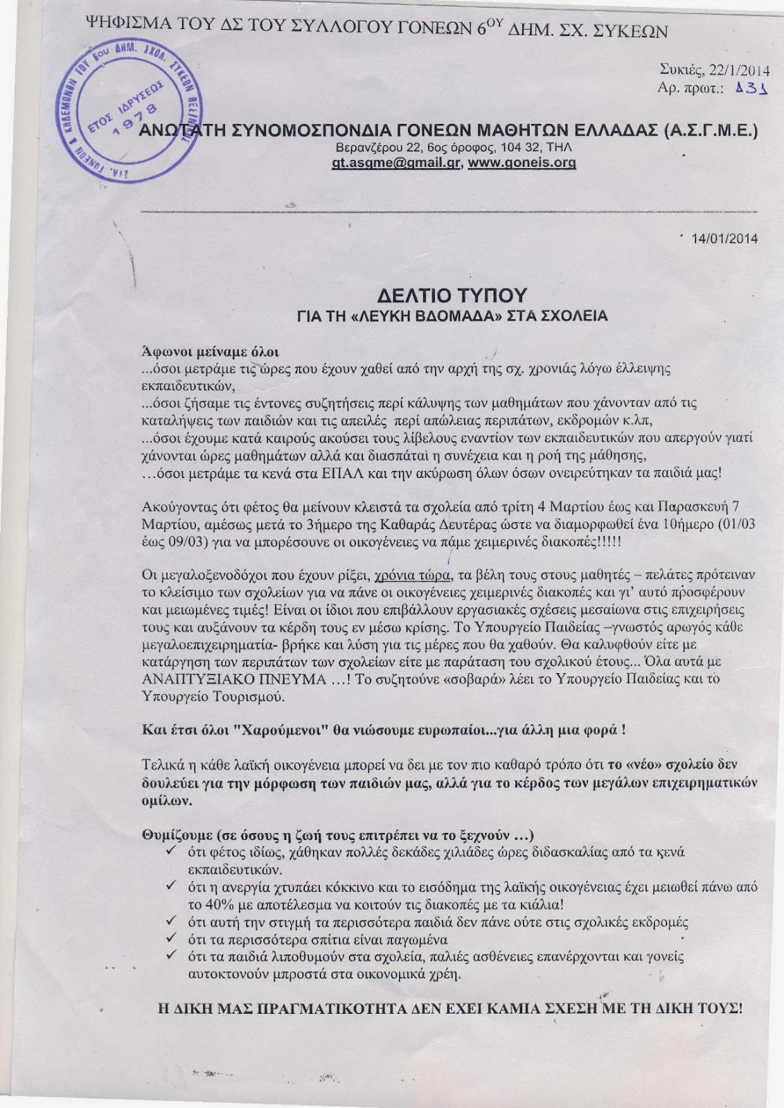 Ψήφισμα του ΔΣ του συλλόγου γονέων 6ου Δημ. σχ. Συκεών για την "Λευκή βδομάδα" και για το My School: "πρόγραμμα "φακελώματος" του ΔΙΚΟΥ ΜΟΥ ΣΧΟΛΕΙΟΥ, ΤΟΥ ΔΙΚΟΥ ΜΟΥ ΠΑΙΔΙΟΥ, ΤΟΥ ΕΑΥΤΟΥ ΜΟΥ!"