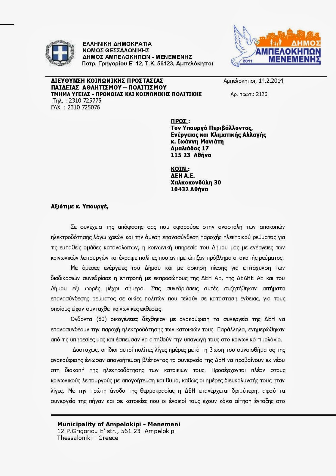 Έγγραφο - διαμαρτυρία του Δήμου Αμπελοκήπων - Μενεμένης σε ΥΠΕΚΑ και ΔΕΗ σχετικά με την διακοπή παροχής ηλεκτρικού ρεύματος λόγω χρεών