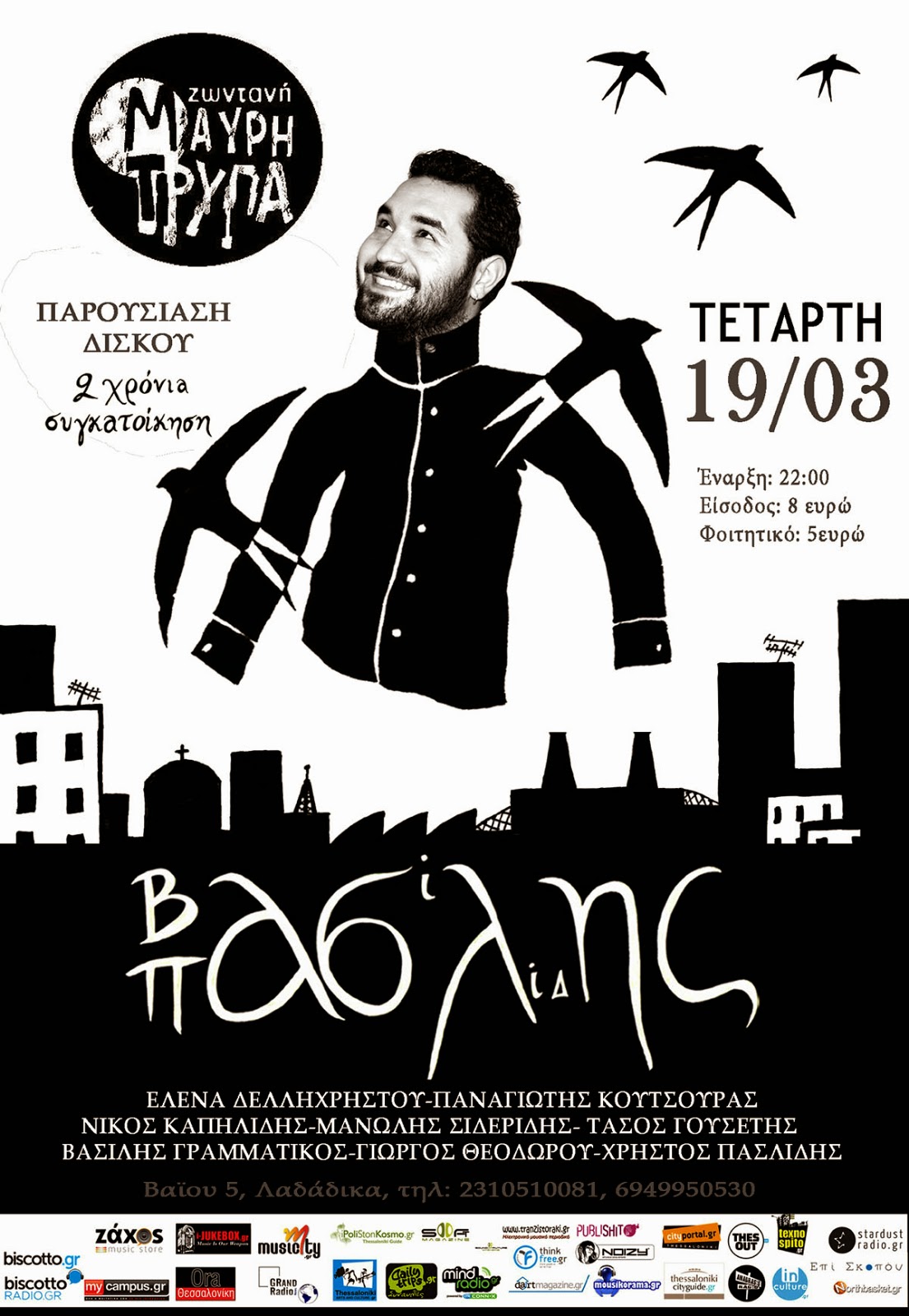 Ο Βασίλης πασλίδης επιστρέφει στην αγαπημένη του Θεσσαλονίκη για να παρουσιάσει για πρώτη φορά στο κοινό της, τα 12 τραγούδια που περιέχει ο δίσκος αλλά και να μοιραστεί μαζί μας τραγούδια που αγάπησε, στις 19 Μαρτίου στη μουσική σκηνή «Μαύρη Τρύπα» στα Λαδάδικα..