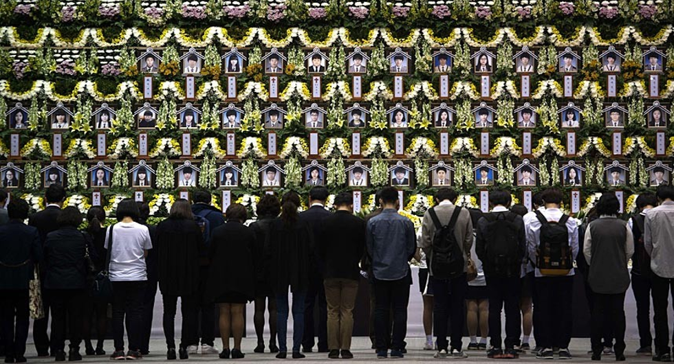 Βαθύτατα συγκινημένοι οι συγγενείς των θυμάτων στέκονται μπροστά στο μνημείο για τα θύματα του βυθισμένου πλοίου της Νότιας Κορέας. Την Παρασκευή 25 Απριλίου το αριθμός των νεκρών ανήλθε σε 183, αλλά 119 άνθρωποι εξακολουθούν να αγνοούνται μετά την τραγωδία της 16ης Απριλίου. Το στιγμιότυπο απαθανάτισε ο Νίκολας Ασφούρι για το Γαλλικό πρακτορείο.
