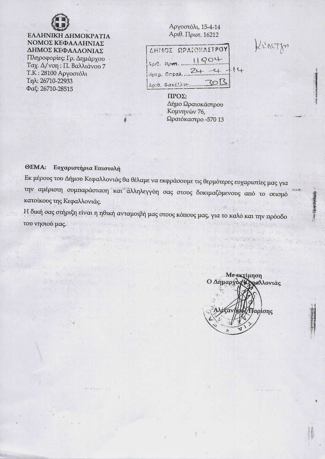 Δελτίο τύπου Δήμου Ωραιοκάστρου: Ευχαριστίες από τους σεισμοπαθείς της Κεφαλλονιάς.