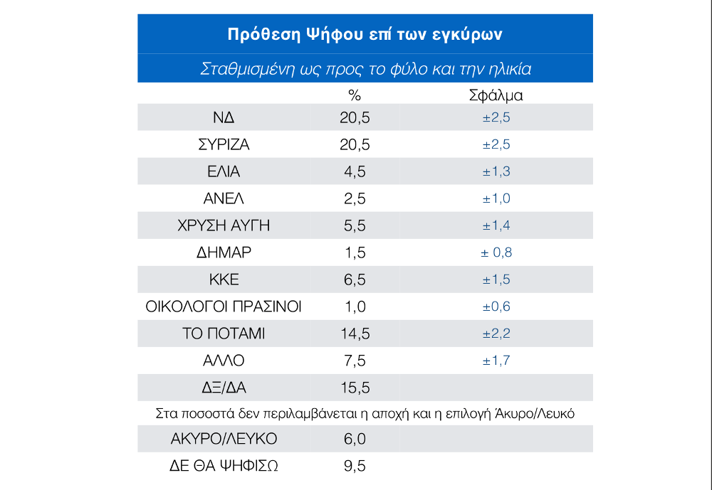 Κι αυτό γιατί τα στοιχεία της έρευνας δείχνουν κλείσιμο της ψαλίδας μεταξύ της ΝΔ και του ΣΥΡΙΖΑ και εκτόξευση του κόμματος Το Ποτάμι, το οποίο προσελκύει ψηφοφόρους από όλα τα κόμματα.