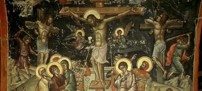Το Θείο Δράμα κορυφώνεται με την καταδίκη του Ιησού σε σταυρικό θάνατο, την μεταμέλεια και τον απαγχονισμό του Ιούδα. Ο Ιησούς βασανίζεται και αναγκάζεται να κουβαλήσει το Σταυρό του στο λόφο του Γολγοθά. Αφήνει το πνεύμα επί του Σταυρού και περιγράφεται το περιστατικό με τους δύο ληστές.
