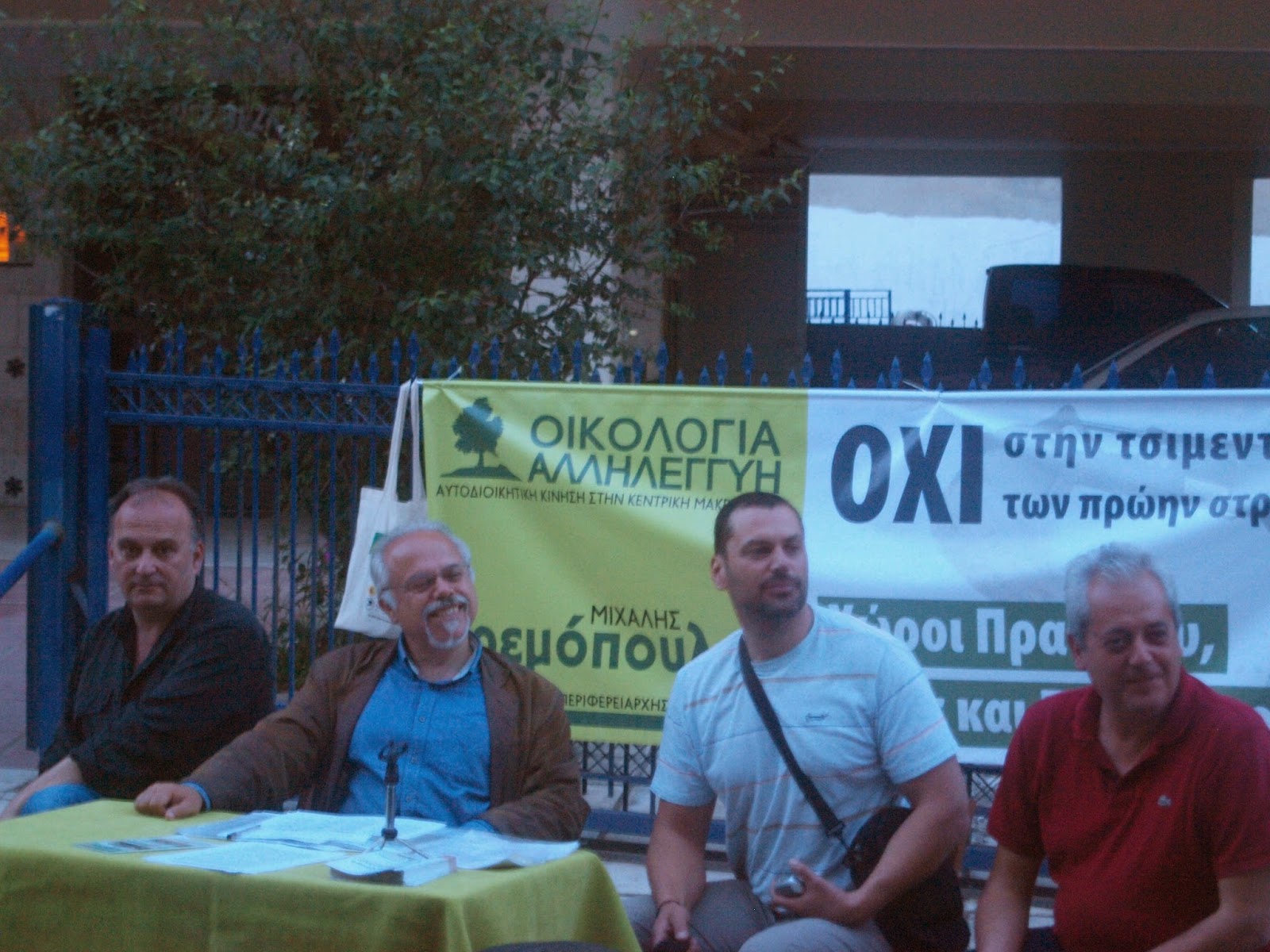 Σε εκδήλωση που διοργανώθηκε στον Εύοσμο, έξω από το στρατόπεδο Παπακυριαζή, με αίτημα τη μη οικοδόμηση ή την εκποίηση των στρατοπέδων ο υποψήφιος περιφερειάρχης Κ. Μακεδονίας Μιχάλης Τρεμόπουλος κατέθεσε τις προτάσεις του κάνοντας παράλληλα αναφορά στους διαχρονικούς αγώνες των μελών της «Οικολογίας-Αλληλεγγύης» για την απόδοση των στρατοπέδων στις τοπικές κοινωνίες, τη διασφάλιση των χώρων πρασίνου, την προστασία του περιβάλλοντος και την αναβάθμιση της ποιότητας ζωής.