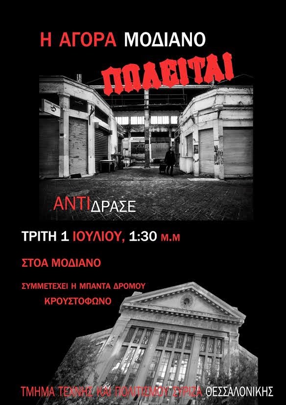 "Η Αγορά ΜΟΔΙΑΝΟ ΠΩΛΕΙΤΑΙ" ΑντιΔρασε, Τρίτη 1 Ιουλίου 1:30 μμ ΣΤΟΑ ΜΟΔΙΑΝΟ, Τμήμα Τέχνης και Πολιτισμού ΣΥΡΙΖΑ Θεσσαλονίκης