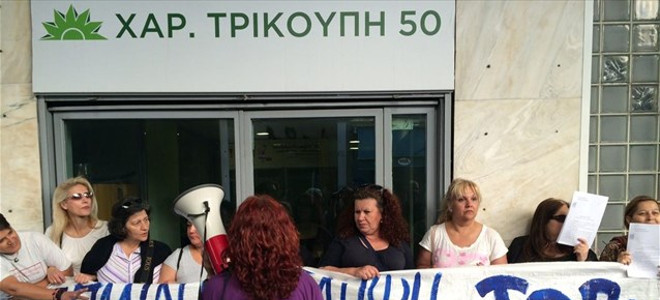 Οι καθαρίστριες του υπουργείου οικονομικών μαζεύτηκαν έξω από τα γραφεία του ΠΑΣΟΚ στη Χαριλάου Τρικούπη και διαμαρτύρονται κρατώντας στα χέρια τους τα χαρτιά της δικαστικής απόφασης.