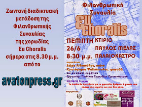 Σας ενημερώνουμε ότι η σημερινή Φιλανθρωπική Συναυλία της χορωδίας Eu Choralis θα μεταδοθεί σε ζωντανή διαδικτυακή σύνδεση.