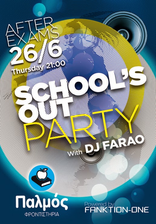 Το καλοκαίρι ήρθε, οι εξετάσεις τελειώνουν και το party της χρονιάς είναι γεγονός. Φιλοξενούμε τον Dj Farao ο οποίος θα παίξει με το κορυφαίο σύστημα ήχου Funktion One την καλύτερη μουσική για όλους τους μαθητές και τους φίλους του Φροντιστηρίου Παλμός. H εκδήλωση θα πραγματοποιηθεί στην αυλή του φροντιστηρίου και κρύβει πολλές εκπλήξεις!!! Με χαρά θα περιμένουμε να σας υποδεχτούμε.Σας παρακαλούμε να το δημοσιεύσετε στην ιστοσελίδα σας.