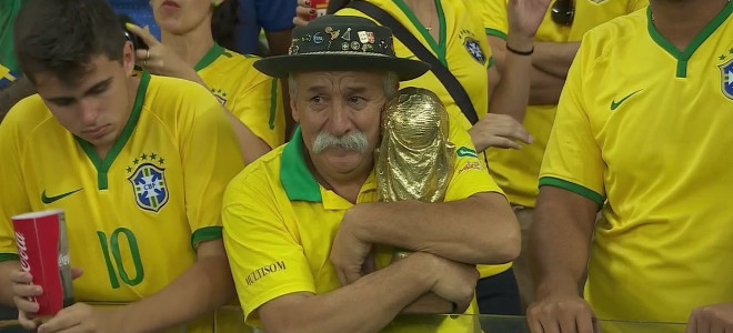 Ο λόγος για τον θλιμμένο κύριο που παρακολουθώντας την ταπείνωση της εθνικής του ομάδας από την Γερμανία παρέμενε «χαμένος» κρατώντας ένα αντίγραφο του Παγκοσμίου Κυπέλλου, του τροπαίου που μόνο η Σελεσάο έχει κατακτήσει περισσότερες φορές.