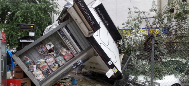 Το τελευταίο περιστατικό που συνέβη είναι η πτώση ενός δέντρου πάνω σε περίπτερο σε κεντρικό σημείο της πόλης, στην οδό Δωδεκανήσου. To δέντρο έπεσε πάνω στο περίπτερο, καθώς και σε δύο αυτοκίνητα που ήταν σταθμευμένα στο σημείο. Τα δύο άτομα που βρίσκονταν μέσα στο περίπτερο, ευτυχώς δεν τραυματίστηκαν.
