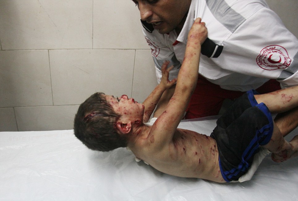 Η φωτογραφία είναι από το νοσοκομείο Αλ Σίφα που βρίσκεται στην πόλη της Γάζας. Μπορούμε να διακρίνουμε το άσχημα τραυματισμένο μικρό αγόρι που με δάκρυα στα μάτια τραβάει το πουκάμισο του νοσηλευτή ενώ αυτός προσκαθεί να τον ξαπλώσει στο κρεβάτι του νοσοκομείου.