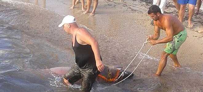 Ενας ψαράς πλησίασε στην ακτή τραβώντας με σχοινί ένα σκυλόψαρο τριών μέτρων, το οποίο είχε πιάσει νωρίτερα με το καΐκι του. Μάλιστα, χρειάστηκε βοήθεια από τους φίλους του, καθώς το βάρος του έφτανε στα 200 κιλά.