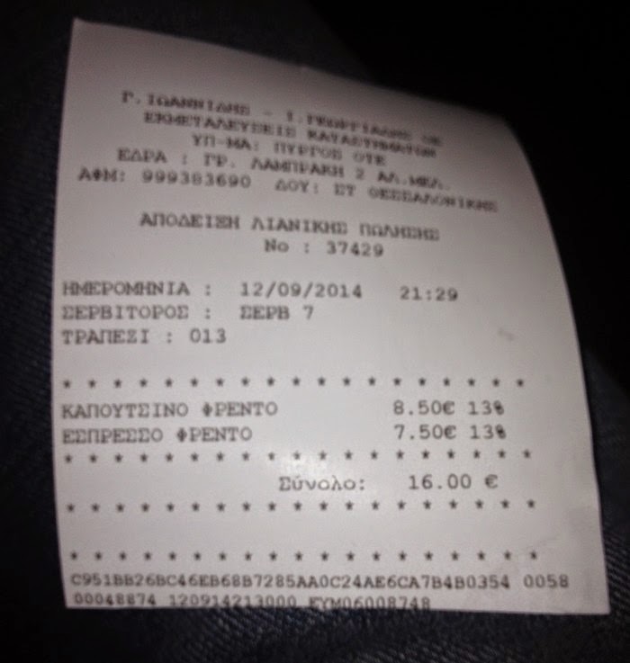 απόδειξης, 2 καφέδες (φρέντο και φρέντο εσπρέσσο) στοίχισαν 16 ευρώ (!!!)