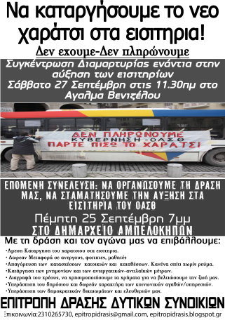 Επιτροπή Δράσης Δυτικών Συνοικιών: ΟΧΙ στο Χαράτσι στα εισιτήρια του ΟΑΣΘ! Δεν έχουμε - Δεν πληρώνουμε!