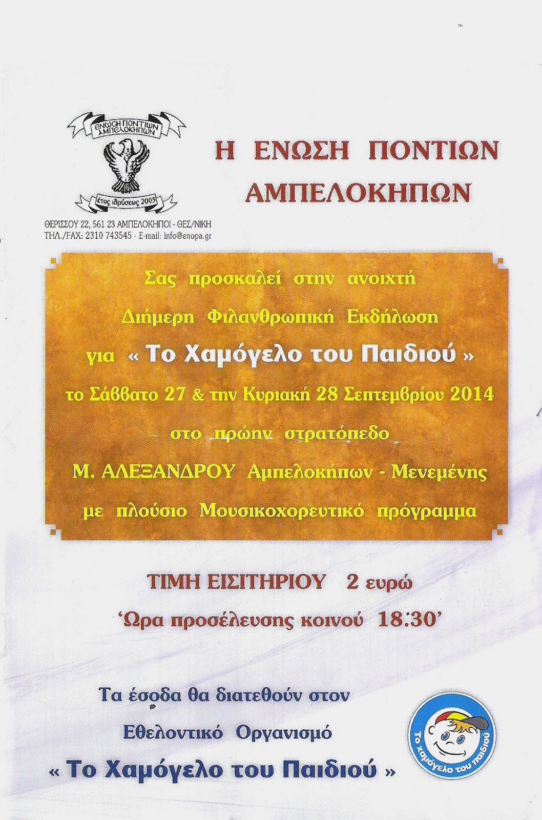 Διήμερο εκδηλώσεων (27 & 28 Σεπτεμβρίου) διοργάνωσε η Ένωση Ποντίων Αμπελοκήπων στο πρ. στρατόπεδο Μεγάλου Αλεξάνδρου Μενεμένης, για την ενίσχυση του "Χαμόγελου του Παιδιού". Η ανταπόκριση του κόσμου στις εκδηλώσεις αυτές, που είχαν φιλανθρωπικό σκοπό ήταν πολύ μεγάλη, γεγονός που μαρτυρεί ότι το κάλεσμα της Ένωσης Ποντίων Αμπελοκήπων είχε επιτυχία όπως και η διοργάνωση των εκδηλώσεων.Παρόντες στις εκδηλώσεις με τα χορευτικά τους αρκετοί ποντιακοί σύλλογοι, όπως της Πολίχνης, Ωραιοκάστρου, Νεάπολης, Καλλιθέας - Συκεών, Φιλύρου, Ελευθερίου - Κορδελιού, Ακρίτες του Πόντου - Σταυρούπολης, Μενεμένης, Μεσαίου κ.α.