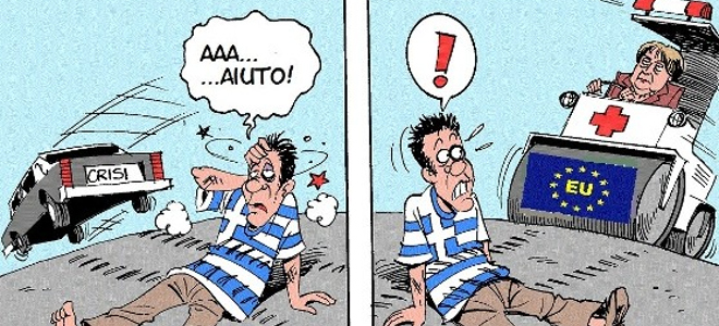 Η ιταλική οικονομική ιστοσελίδα επιλέγει στην ανάλυσή της να βάλει το σκίτο της Ελλαδας ως πεζό που χτυπιέται από το αυτοκίνητο της κρίσης και ισοπεδώνεται από τον οδοστρωτήρα της Μέρκελ