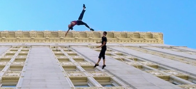 Μία εξαιρετικά εντυπωσιακή χορογραφία στον αέρα εκτέλεσαν δύο χορευτές, οι οποίοι κρεμάστηκαν με σχοινιά στους τοίχους του Δημαρχείου στο Οκλαντ και χάρισαν θέαμα.