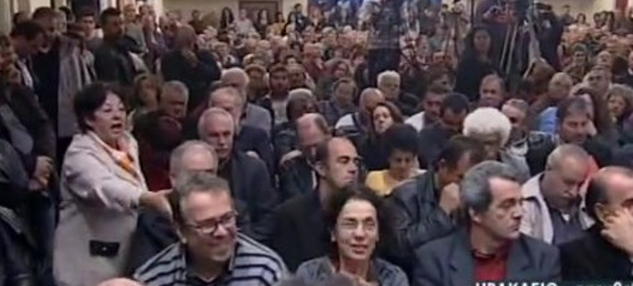 Κατά τη διάρκεια της ομιλίας του κ. Τσίπρα στο Ηράκλειο, μία γυναίκα τον διέκοψε, καθώς σηκώθηκε όρθια και αγανακτισμένη φώναξε: «Από τους φτωχούς τα πήρανε, οι κλέφτες τα φάγανε και τα τρώνε μέχρι τώρα και εδώ μέσα γεμάτο είναι. Έναν-έναν τους ξέρουν».