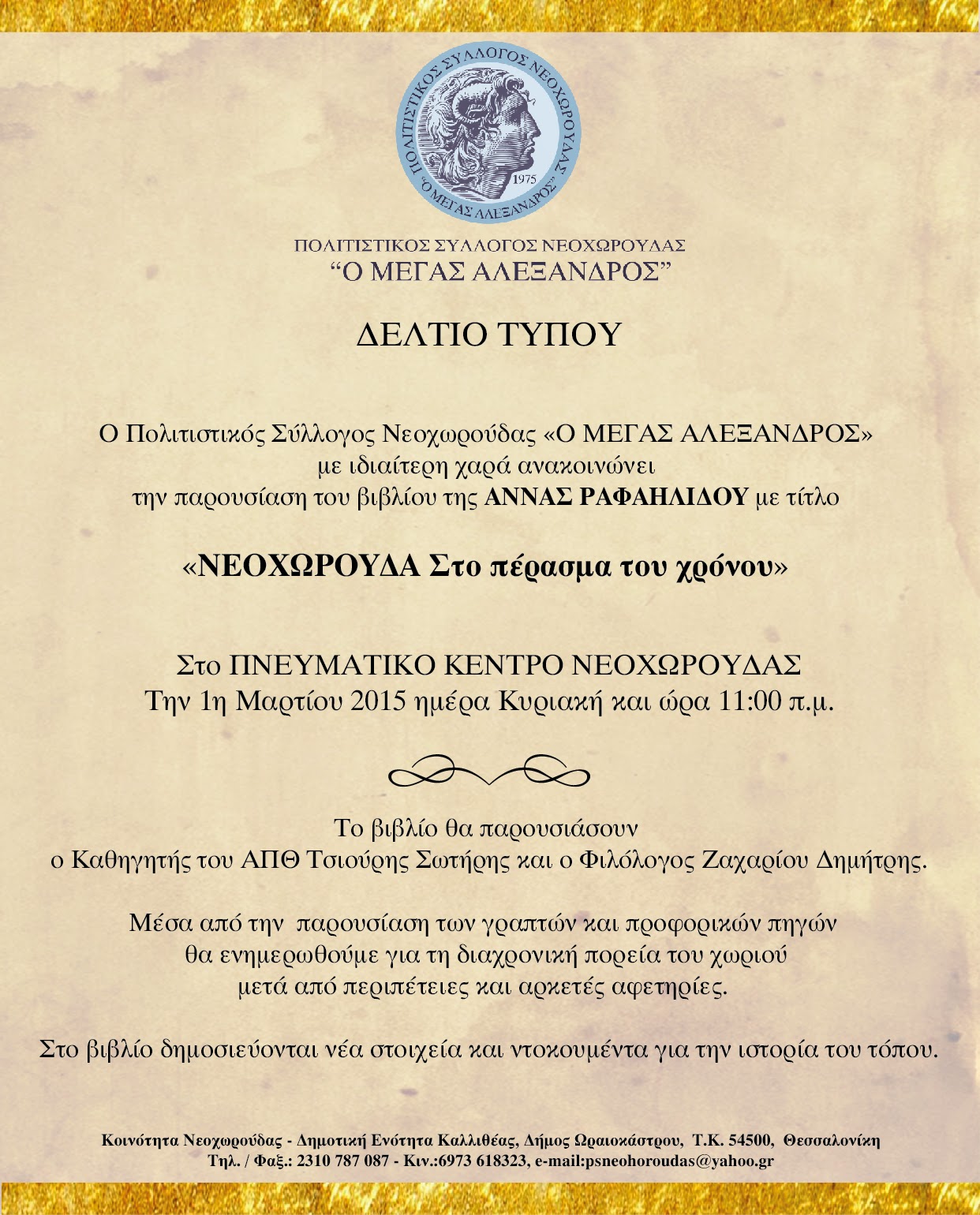 "ΝΕΟΧΩΡΟΥΔΑ Στο πέρασμα του χρόνου" παρουσίαση του βιβλίου της Άννας Ραφαηλίδου - Κυριακή 1 Μαρτίου, 11.00 πμ Πνευματικό Κέντρο Νεοχωρούδας