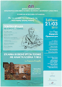 Δ. Ωραιοκάστρου: Ποιητική βραδιά με Ιατρούς - Ποιητές - Εγκαίνια Έκθεσης Έργων Τέχνης με Ανακυκλώσιμα Υλικά, Σάββατο 21/3/2015, 7.00 μμ