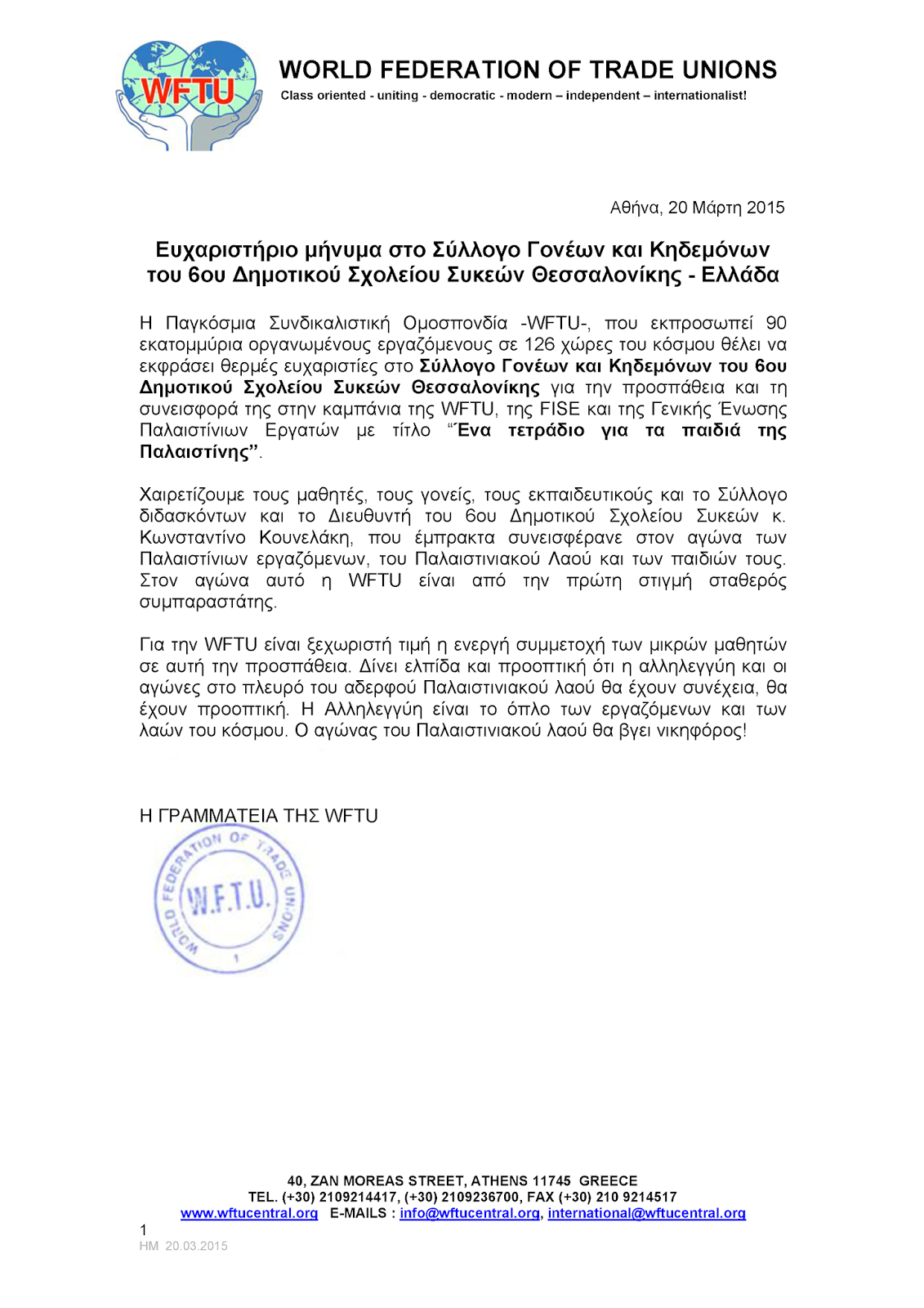 Ευχαριστήριο μήνυμα στο Σύλλογο Γονέων και Κηδεμόνων του 6ου Δημοτικού Σχολείου Συκεών Θεσσαλονίκης - Ελλάδα