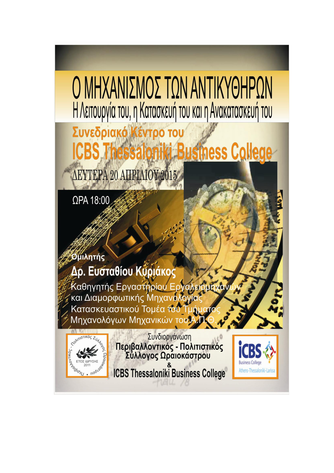 Διάλεξη για τον "Μηχανισμό των Αντικυθήρων", Δευτέρα 20/4/ στις 18.00 μμ απο τον Περιβαλλοντικό - Πολιτιστικό σύλλογο Ωραιοκάστρου