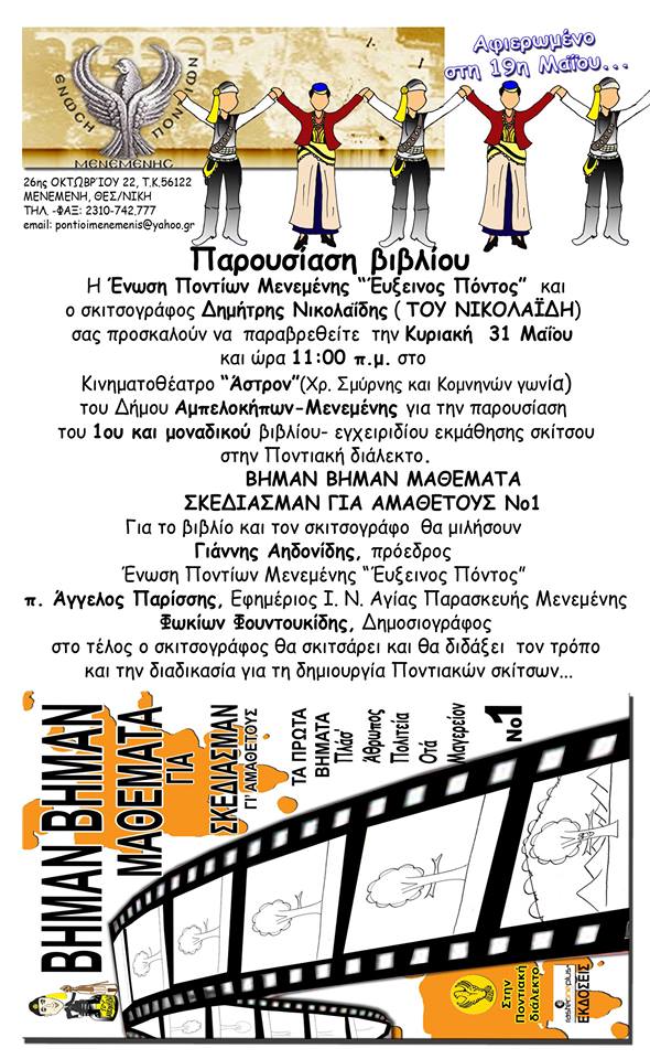 σας προσκαλούν να παραβρεθείτε την ΚΥΡΙΑΚΗ 31 ΜΑΪΟΥ 2015 και ώρα 11:00 π.μ. στο Κινηματοθέατρο "ΑΣΤΡΟΝ" επι της οδού Χρ. Σμύρνης και Κομνηνών γωνία του Δήμου Αμπελοκήπων-Μενεμένης για την παρουσίαση του 1ου και μοναδικού βιβλίου-εγχειρίδοιου εκμάθησης σκίτσου στην Ποντιακή διάλεκτο."ΒΗΜΑΝ ΒΗΜΑΝ ΜΑΘΕΜΑΤΑ ΓΙΑ ΣΧΕΔΙΑΣΜΑΝ ΓΙ' ΑΜΑΘΕΤΟΥΣ Νο 1"