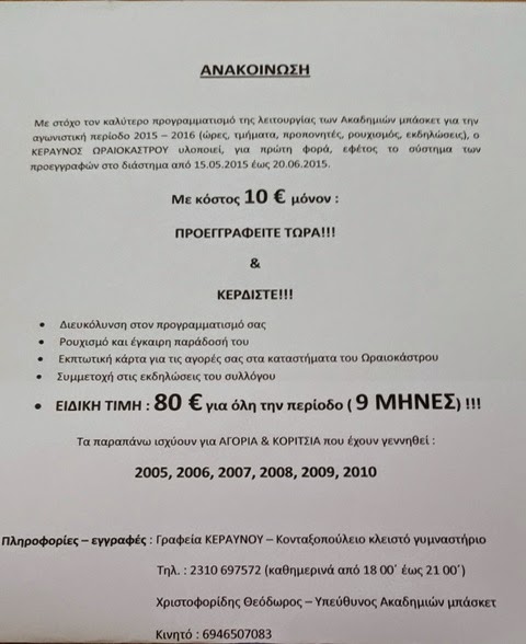 Κεραυνός Ωραιοκάστρου: ανακοίνωση για προεγγραφές στις ακαδημίες μπασκετ